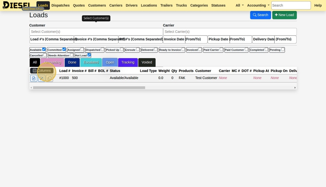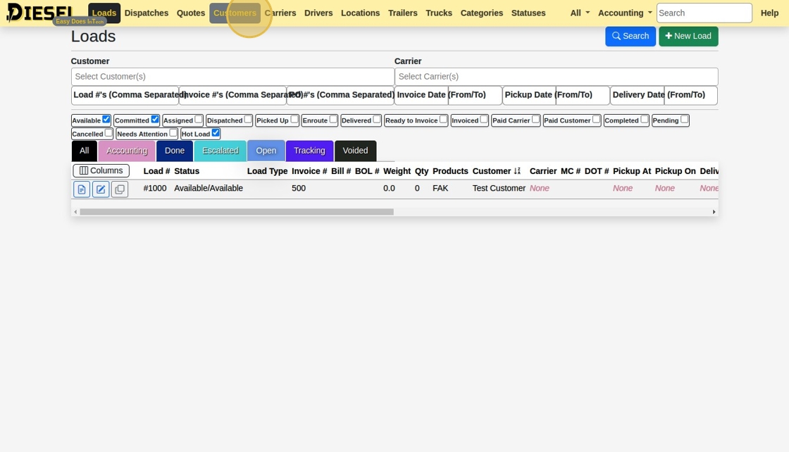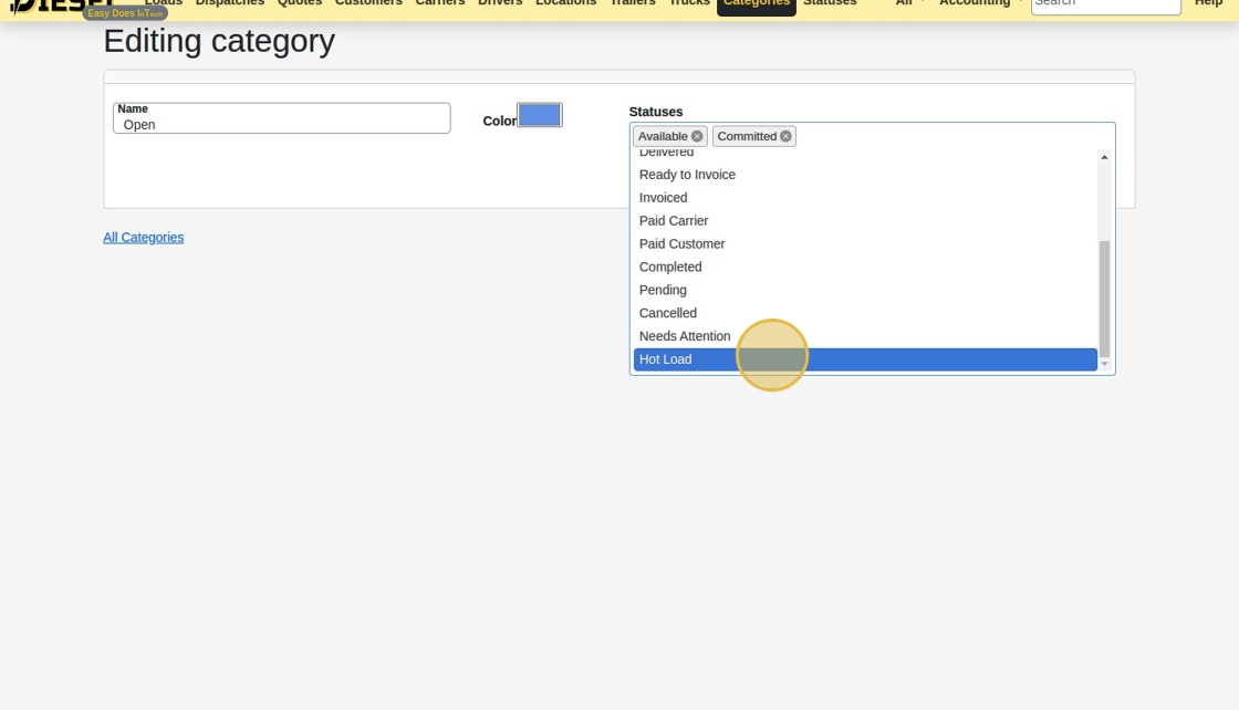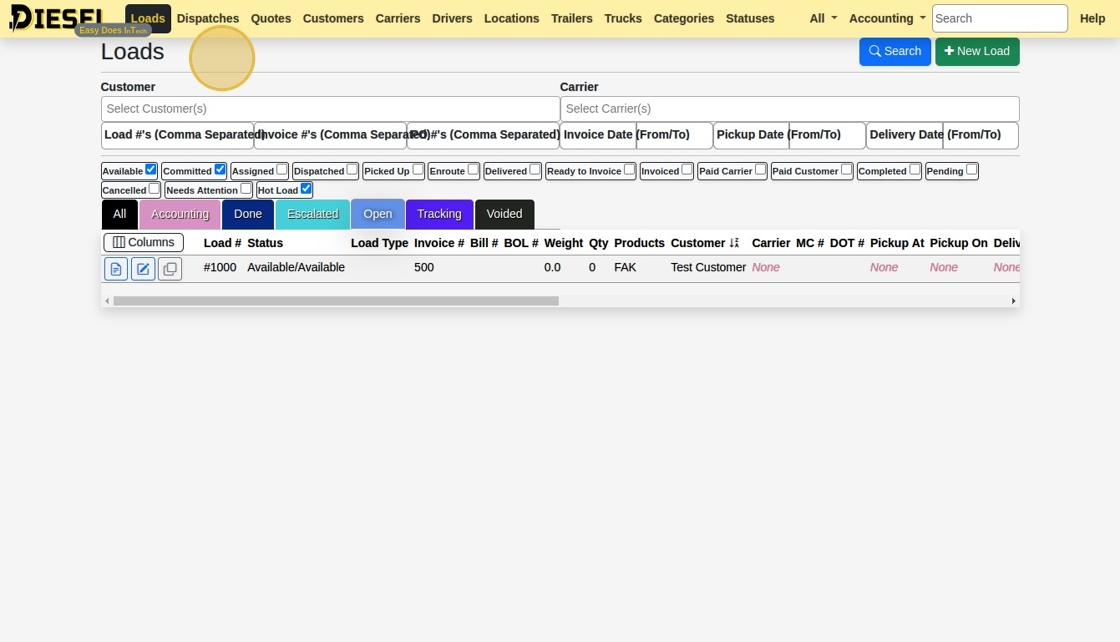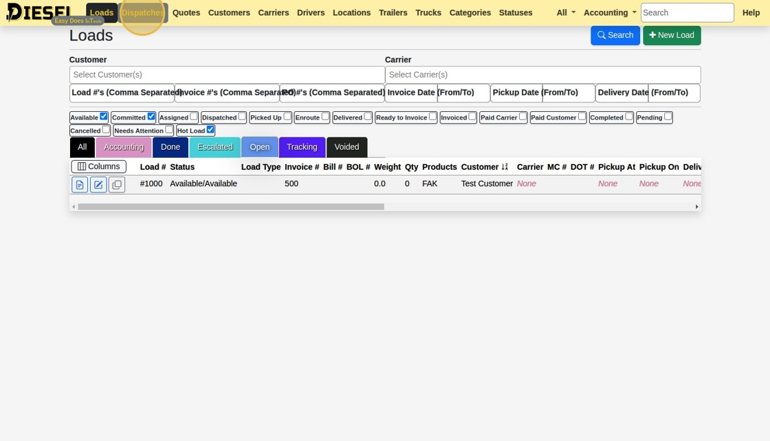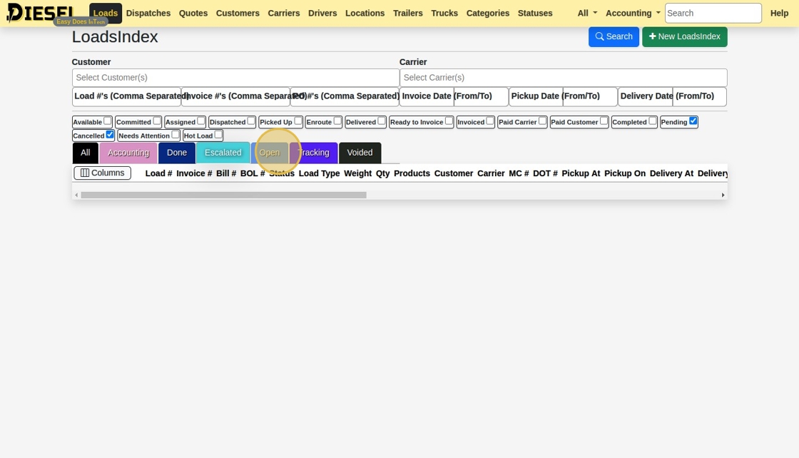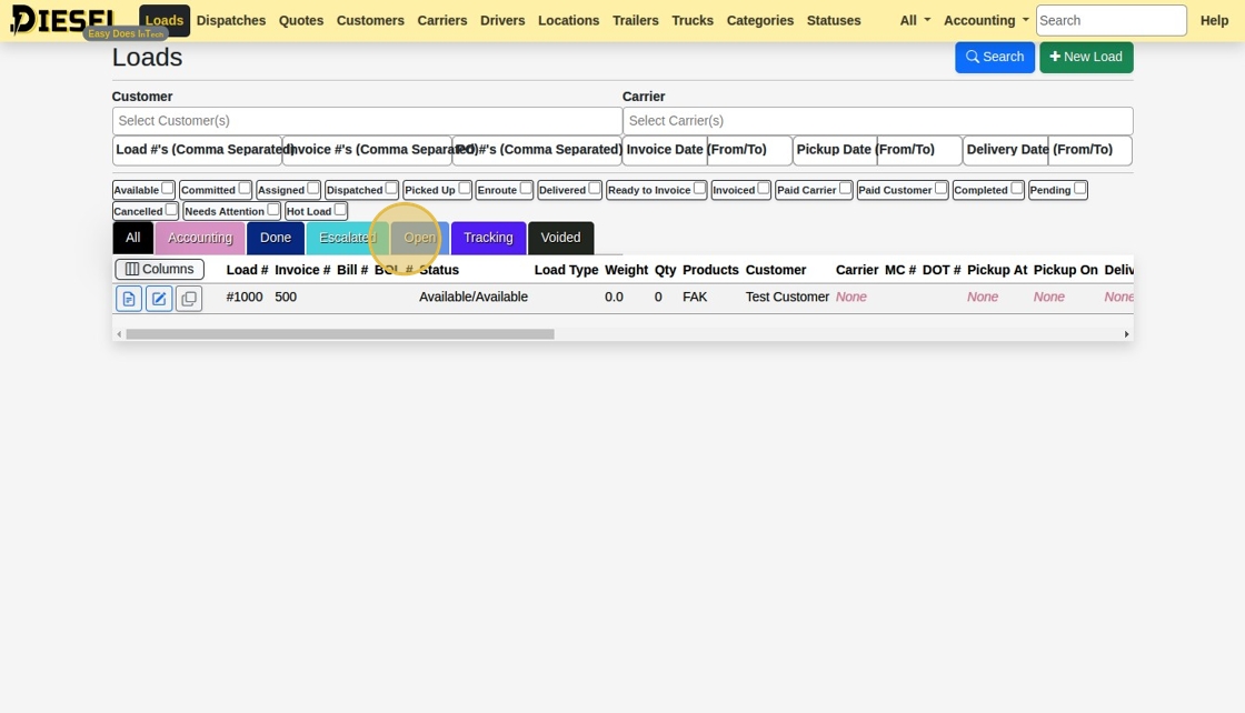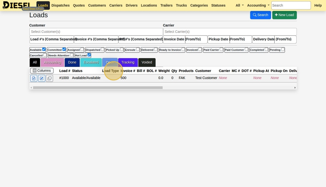 13. The "Hot Load" Status has been added to the list of Statuses. Clicking the "Open" Category Tab displays loads with only the associated Statuses.