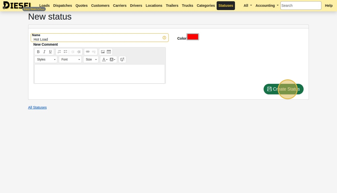 7. Let's create a new Status named "Hot Load" and make it's color Red.